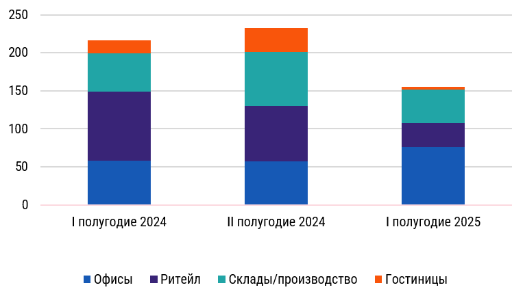 По данным аналитического отчета Commonwealth Partnership (CMWP) #MARKETBEAT, сумма инвестиций в коммерческую недвижимость составила 156 млрд руб. за первые шесть месяцев 2025 г. Это на 28% меньше по сравнению с аналогичным периодом 2024 г., когда инвестиции составили 216 млрд руб. Общий прогноз объема инвестиций в коммерческую недвижимость на 2025 г. составляет 300 — 350 млрд руб.