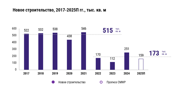 В 2025 г. строительная активность останется сниженной, прирост новых площадей будет происходить за счет «достройки» объектов с ранее перенесенными сроками ввода в эксплуатацию. По оценкам CMWP, по итогам 2025 г. можно прогнозировать объем нового строительства (Россия за исключением Москвы) на уровне 159 тыс. кв. м.